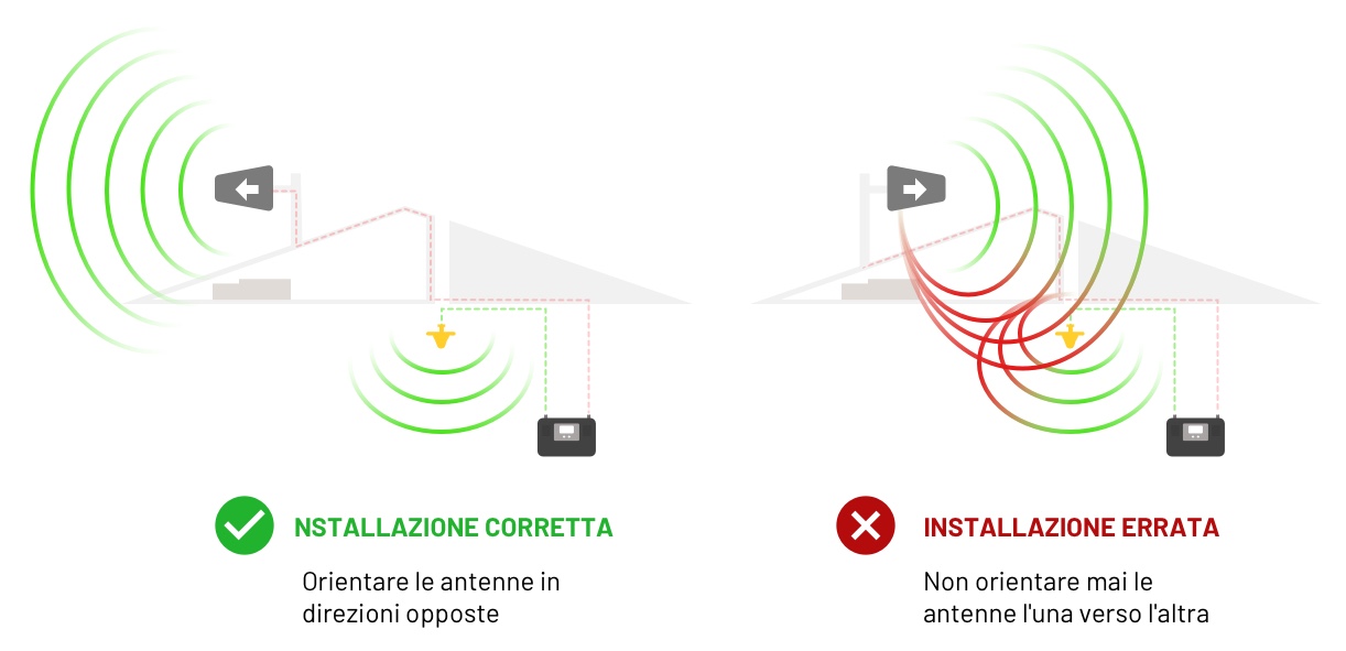 Importante: Assicurati che ci sia una distanza sufficiente tra le antenne esterne e interne per evitare interferenze. Non accendere l'amplificatore prima che le antenne siano posizionate a una distanza adeguata l'una dall'altra.
