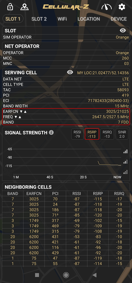 Per controllare la banda di frequenza e la forza del segnale, consigliamo l'app CellularZ disponibile su Google Play.