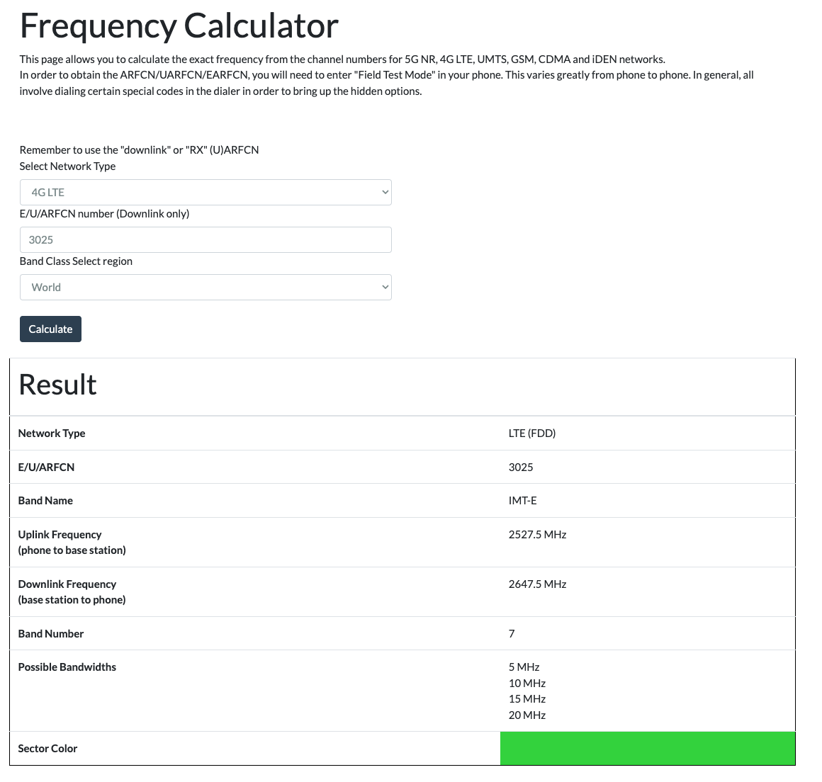 Visitate il calcolatore di frequenza CellMapper. Selezionate il tipo di rete (ad esempio, 2G, 3G, 4G, 5G) e inserite il numero E/U/ARFCN (solo downlink) dal test del vostro telefono.